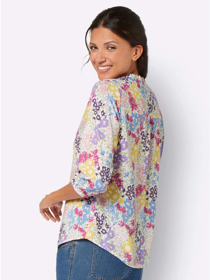 Яркая и жизнерадостная блузка с цветочным принтом. Свободный фасон без застежек, игривый рюш на круглом вырезе с небольшим V-образным вырезом и завязками. Вытачки на груди, рукава длиной 3/4 с эластичными манжетами, присборенная кокетка сзади и слегка скругленный низ. Из мягкой, эластичной ткани.