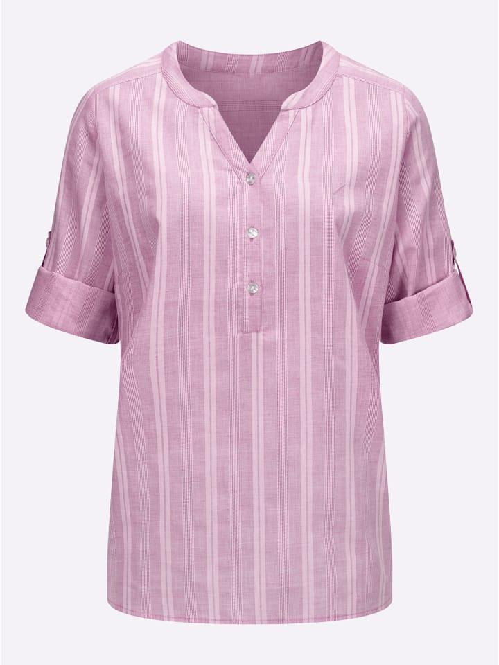 Эта блузка без застежки обладает множеством преимуществ: удобная посадка, высококачественный узор в полоску, окрашенный пряжей, и рукава длиной 3/4 с хлястиками, которые можно подвернуть до середины длины. Круглый вырез с небольшим V-образным вырезом и короткой планкой на пуговицах, вставка на плечах, формирующие вытачки на груди и слегка скругленный низ.