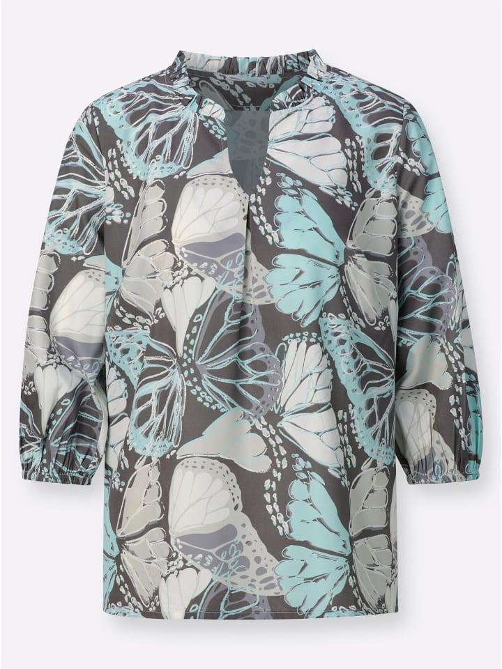 Эта блузка с рукавами 3/4 украшена оригинальным узором в виде крупных бабочек по всей длине, создающим элегантный образ. Круглый вырез горловины с небольшим V-образным вырезом и оборкой, вытачками на груди и складкой спереди. Свободный крой рукавов 3/4 с эластичными манжетами по низу.
