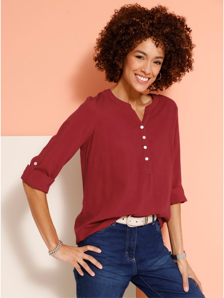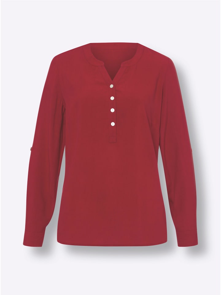 Чудесная мягкая блузка без застежки с красивыми перламутровыми пуговицами на вырезе и на длинных рукавах, которые можно подвернуть и застегнуть на пуговицы до длины 3/4. С вытачками на груди спереди и кокеткой сзади для удобной посадки.