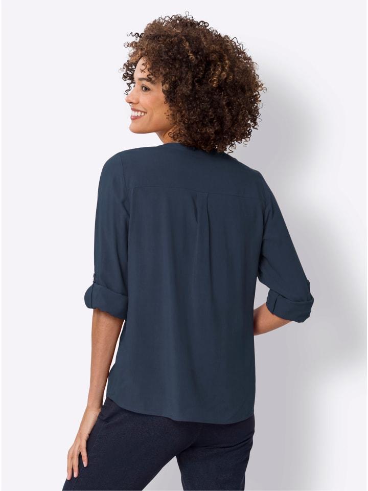 Чудесная мягкая блузка без застежки с красивыми перламутровыми пуговицами на вырезе и на длинных рукавах, которые можно подвернуть и застегнуть на пуговицы до длины 3/4. С вытачками на груди спереди и кокеткой сзади для удобной посадки.