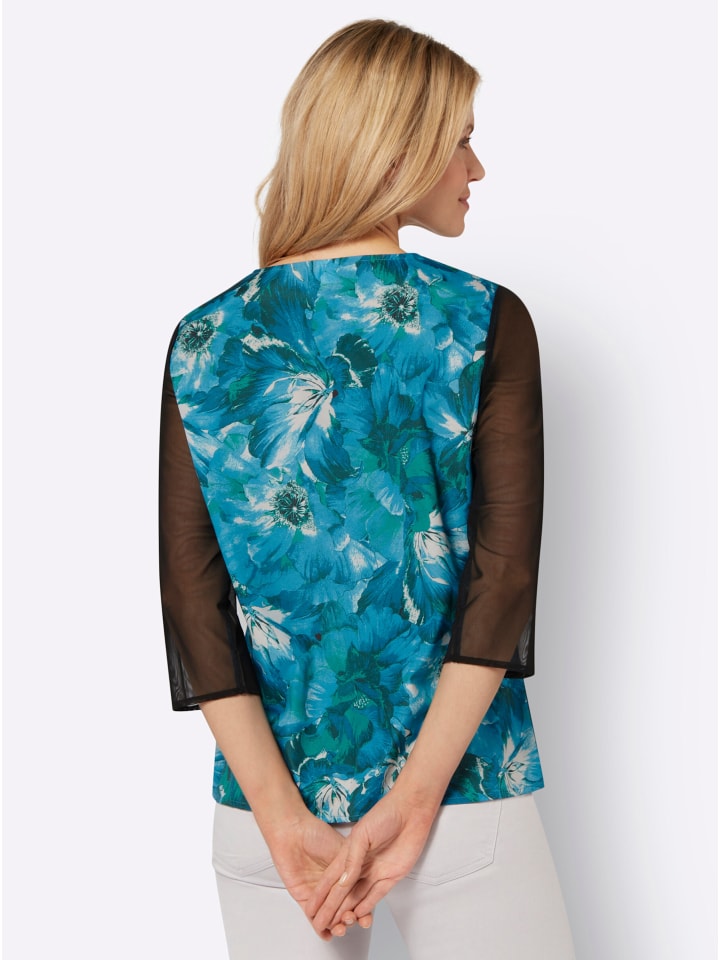 Модный аксессуар: женственная блузка без застежек с цветочным принтом. Изящный V-образный вырез. Слегка прозрачные однотонные рукава длиной 3/4.