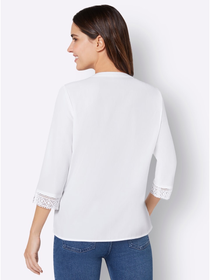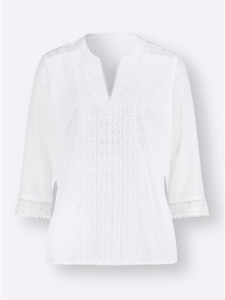 Абсолютно высший класс! Блузка без застежки с изысканными кружевными вставками на плечах, спереди и по краю рукавов длиной 3/4 с разрезами. Круглый вырез с открытым V-образным вырезом. Изготовлена из крепа, не требующего особого ухода.