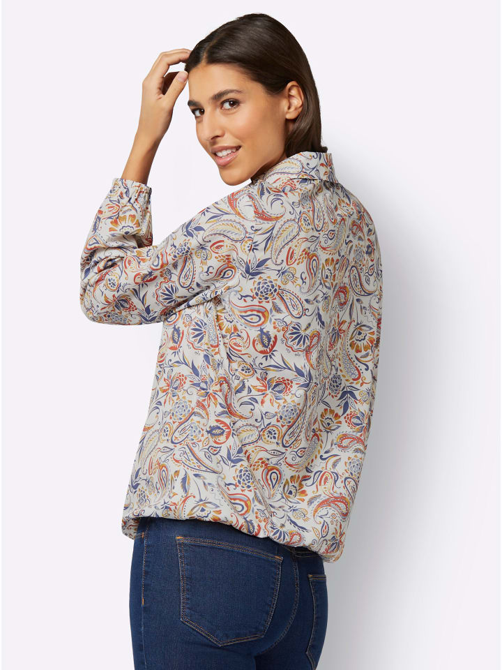 Яркий, жизнерадостный дизайн с узором пейсли, цветами и листьями: универсальная блузка без застежки с аккуратным рубашечным воротником и короткой планкой на пуговицах. Вытачки на груди придают форму. Плотно прилегающие эластичные манжеты на длинных рукавах и подоле очень удобны!