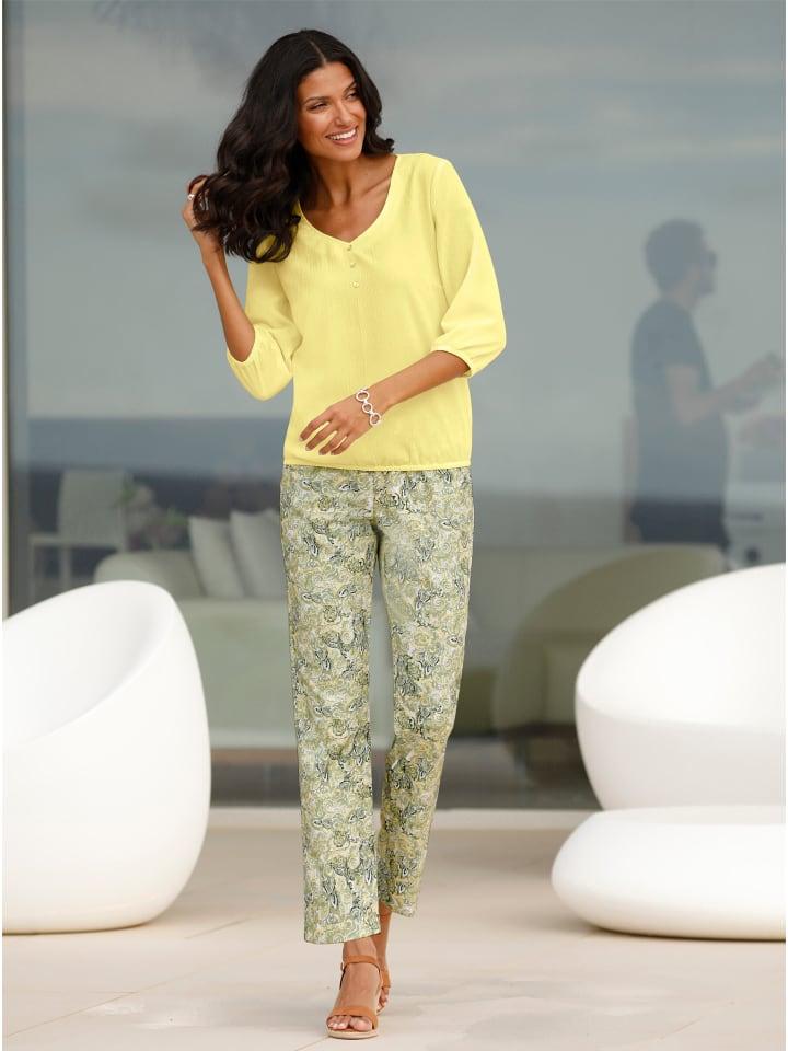 Блузка без застежки из крепа, не требующего глажки, с характерным жатым эффектом. Округлый V-образный вырез с декоративными пуговицами в тон. Эластичные манжеты на рукавах длиной 3/4 и подоле скрывают подол.