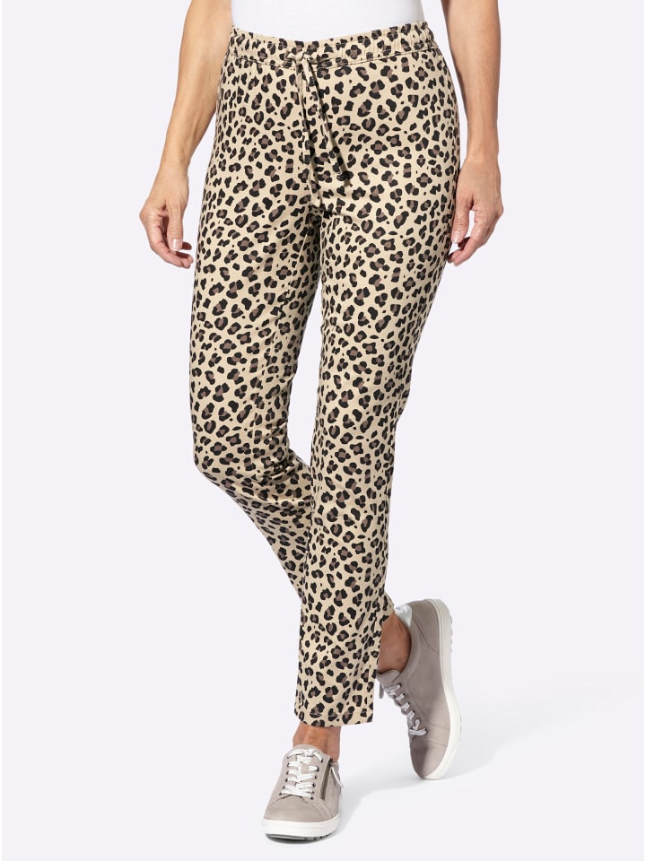 Законодатель моды в джунглях: эти брюки из твила с леопардовым принтом - просто must-have! Удобный крой без застежек, пояс на резинке по всему периметру и завязка. Вытачки сзади для идеальной посадки. Ширина до щиколотки: около 34 см.