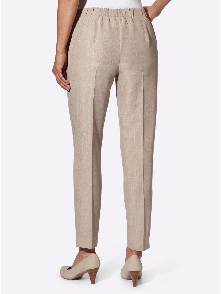 Стильные и удобные? Эти пестрые брюки с эффектом льна доказывают, что это возможно. Они имеют визуально удлиняющие, аккуратные складки. Эластичный пояс сзади, планку с имитацией молнии и два закругленных кармана спереди. Ширина до щиколотки примерно 34 см. Изготовлены из переработанного полиэстера.