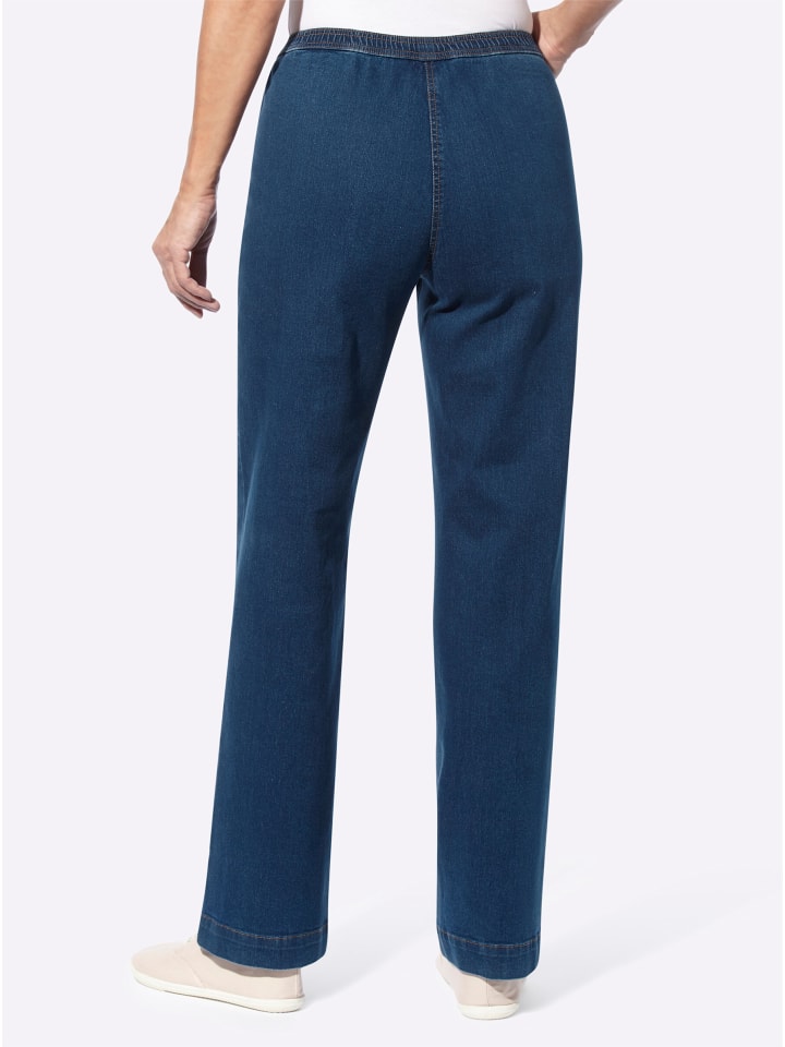 Комфорт и стиль в одном: эти джинсы впечатляют удобным эластичным поясом и модными широкими брючинами. Ширина щиколотки примерно 50 см.