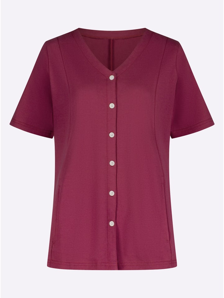 Универсальная куртка-рубашка А-силуэта. V-образный вырез и застежка на пуговицы по всей длине. Удлиняющие швы. 2 кармана и короткие рукава.