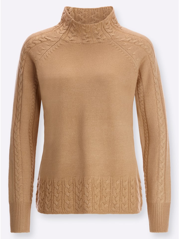 Пушистый, как кашемир! Этот свитер с воротником-стойкой связан искусной вязкой. Воротник украшен узором косички, длинные рукава реглан и подол. Передняя и задняя части выполнены из гладкого трикотажа. Манжеты в рубчик.