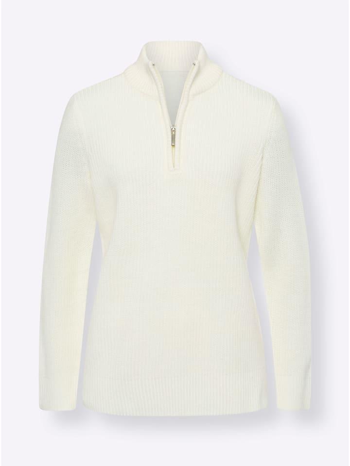 Свободный джемпер в рубчик с застежкой-молнией на воротнике-стойке. Длинные рукава и удобные боковые разрезы. Манжеты в рубчик.