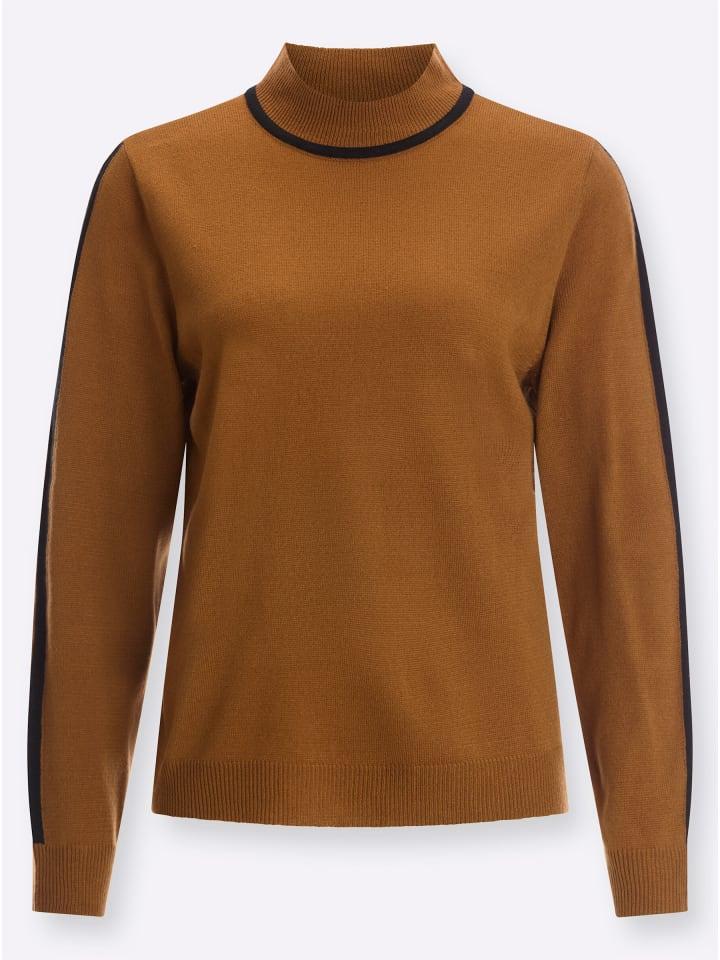 Этот свитер с длинными рукавами искусно создает контрасты. С привлекательным воротником-стойкой и ребристыми манжетами.
