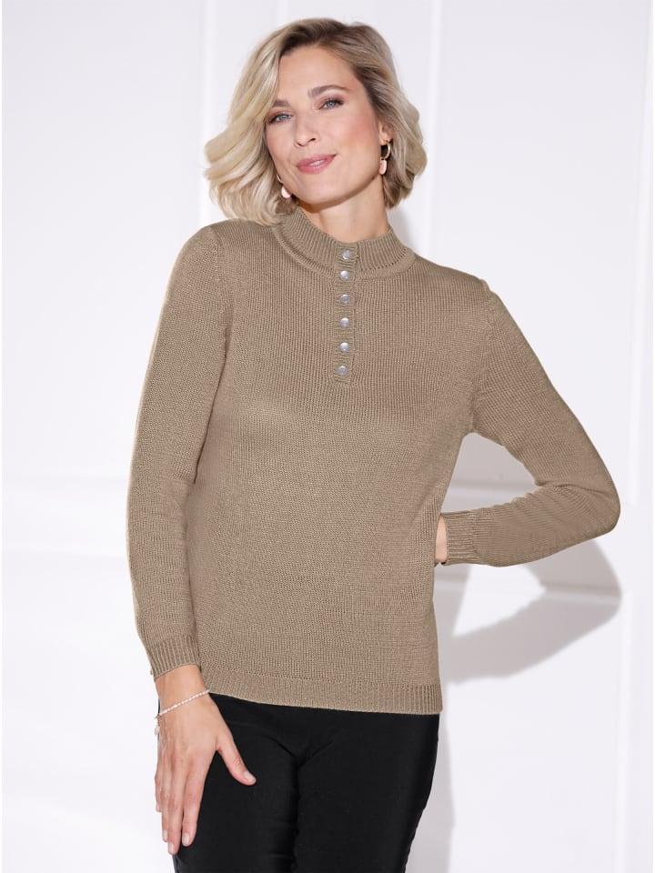Этот простой в уходе свитер с воротником-стойкой - настоящая классика. Воротник с короткой планкой и декоративными пуговицами, а также манжеты на длинных рукавах и подол выполнены в резинку. Тщательно вывязанный трикотаж, придающий форму.