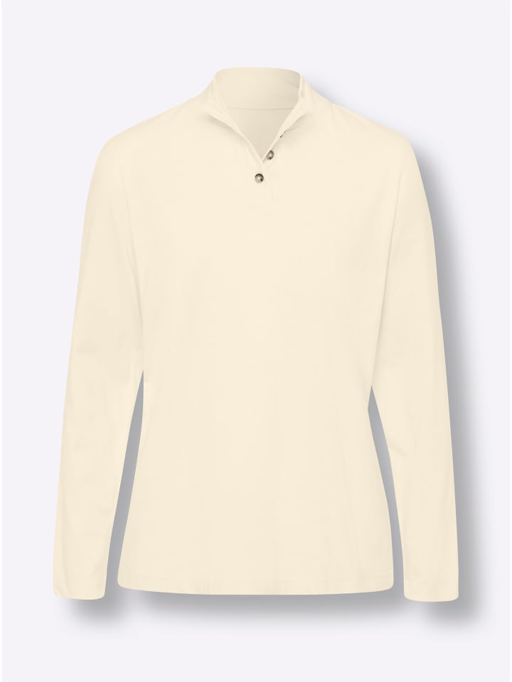 Эффектные декоративные пуговицы с мраморным рисунком на короткой планке придают этой приятной на ощупь рубашке особый шарм. Она имеет привлекательный воротник-стойку и длинные рукава.