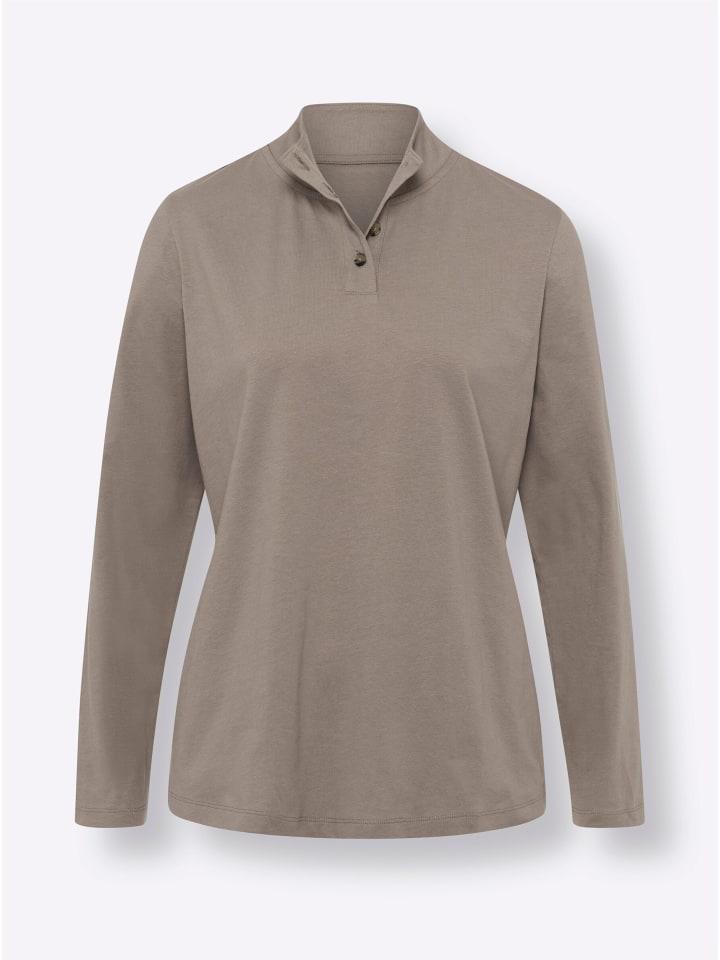 Эффектные декоративные пуговицы с мраморным рисунком на короткой планке придают этой приятной на ощупь рубашке особый шарм. Она имеет привлекательный воротник-стойку и длинные рукава.