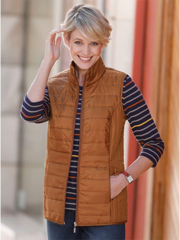 Всегда привлекательный вариант для создания образа: стеганый жилет с теплым воротником-стойкой, застежкой-молнией и карманами в швах. Продольная стежка по бокам визуально удлиняет фигуру и, таким образом, выгодно подчеркивает ее. Моделирующие венские швы.