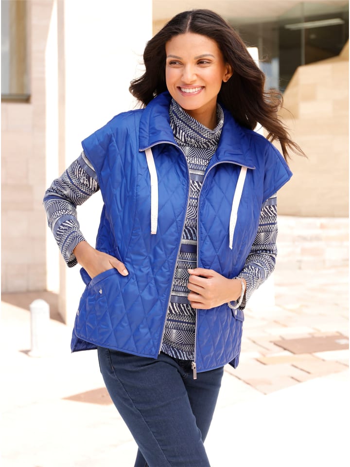 Этот стеганый жилет с ромбовидной стежкой согреет вас, подчеркнет вашу фигуру и подчеркнет ее изяществом благодаря мелким, изящным деталям. Он имеет свободный крой со спущенными плечами, отложным воротником на кулиске и завязкой, украшенной сверкающими камнями, длинной молнией и двумя карманами. Также он имеет два кармана с клапанами на кнопках и боковые разрезы на кнопках. Сзади жилет немного удлинен.