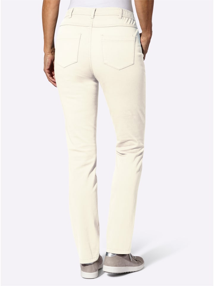 Эластичные брюки из комфортной саржи. Эластичный пояс сбоку для дополнительного комфорта. Шлевки для ремня, застежка на пуговицу и молнию спереди. Свободный крой с пятью карманами, двумя большими накладными карманами и карманом для монет спереди. Два накладных кармана сзади и приталенная кокетка сзади. Ширина до щиколотки примерно 34 см. Без ремня.