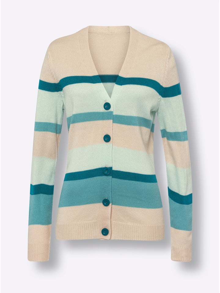Представляем! Ваш модный спутник на каждый день! Кардиган, не требующий сложного ухода, с полосатым узором в тон. С V-образным вырезом и планкой на пуговицах. Ребристые манжеты на длинных рукавах и по низу.