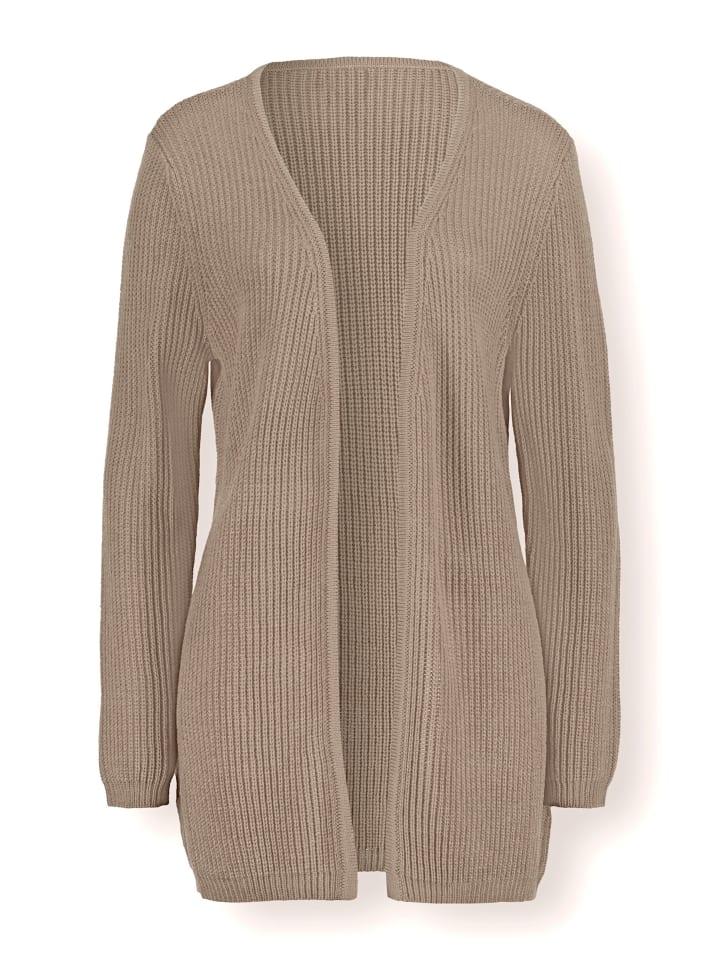 Абсолютный маст-хэв: простой в уходе длинный кардиган с модным узором вязки и выгодно подчеркивающим фигуру открытым кроем с V-образным вырезом, визуально удлиняющим фигуру. Ребристые манжеты на длинных рукавах и подоле.