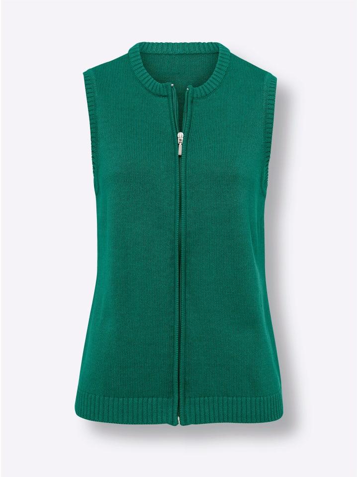 Этот удобный трикотажный жилет станет вашим повседневным спутником для множества образов. Круглый вырез, молния по всей длине и ребристые манжеты.