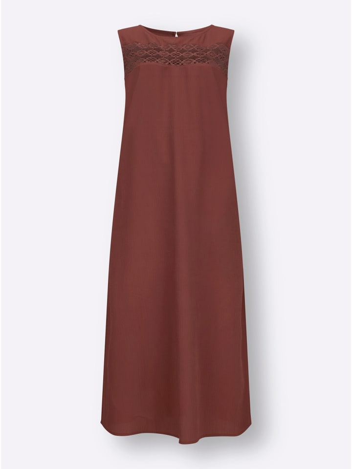 Красивое вязаное крючком кружево спереди придает этому платью с плетеными бретелями популярный этнический образ! Круглый вырез горловины и вытачки для придания формы груди. Сзади: застежка на пуговицы, разрез и вытачки на талии. Два кармана в боковых швах. Удлиненные боковые разрезы для большей свободы движений. Изготовлено из ткани, не требующей глажки, с эффектом жатости.