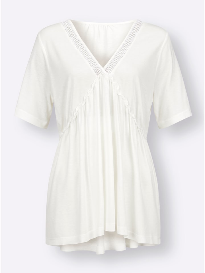 Эта туника-рубашка очаровывает с первого взгляда кружевной вставкой на V-образном вырезе и небольшими оборками спереди и сзади. Приятная мягкая ткань.