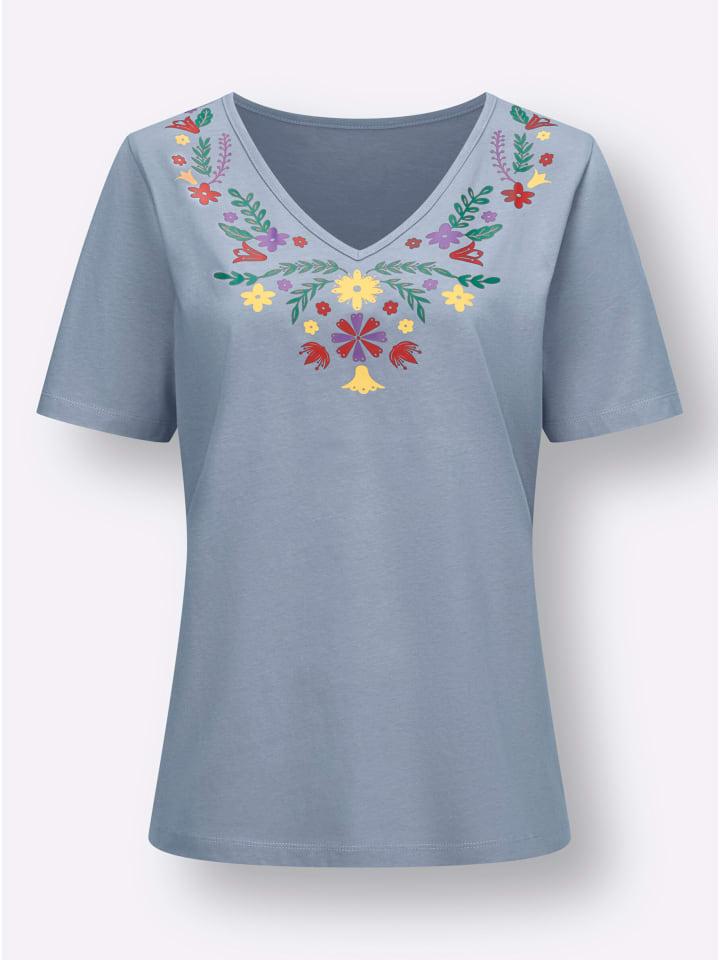 Эта универсальная вещь из чистого хлопка позволяет цветам говорить: рубашка с короткими рукавами и цветочным принтом на V-образном вырезе.
