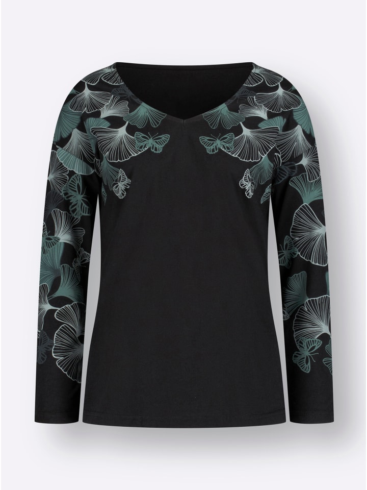 Рубашка с V-образным вырезом, ярким сочетанием однотонных участков и гармоничным узором гинкго сверху и на длинных рукавах. Приятная на ощупь ткань.