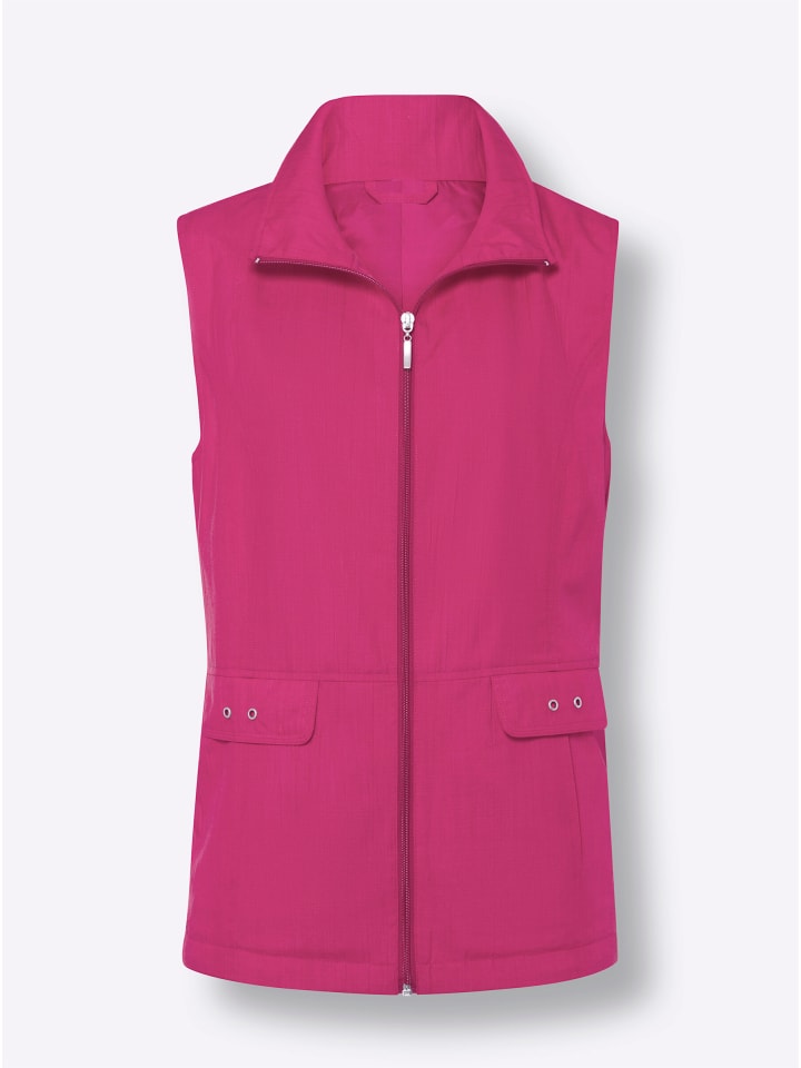 Универсальный жилет из привлекательной ткани с жатым переплетением. Отложной воротник, молния по всей длине и венские швы спереди и сзади для идеальной посадки. Два кармана в швах с имитацией клапанов и люверсами. Легко ухаживать.