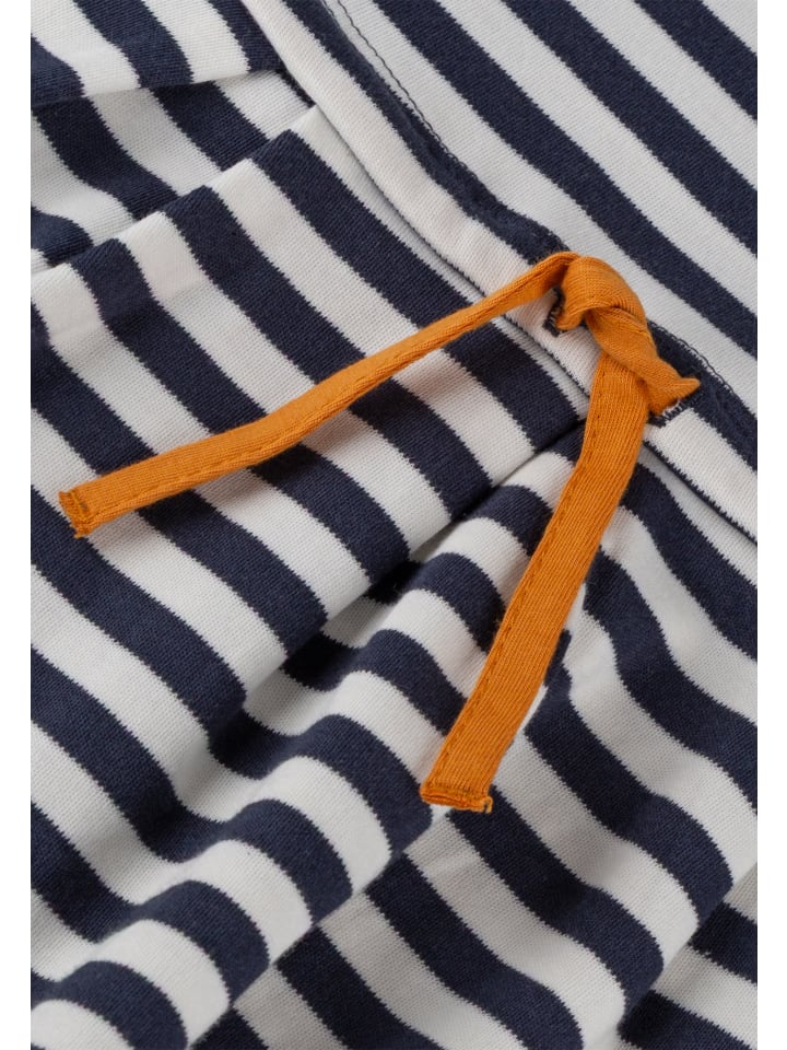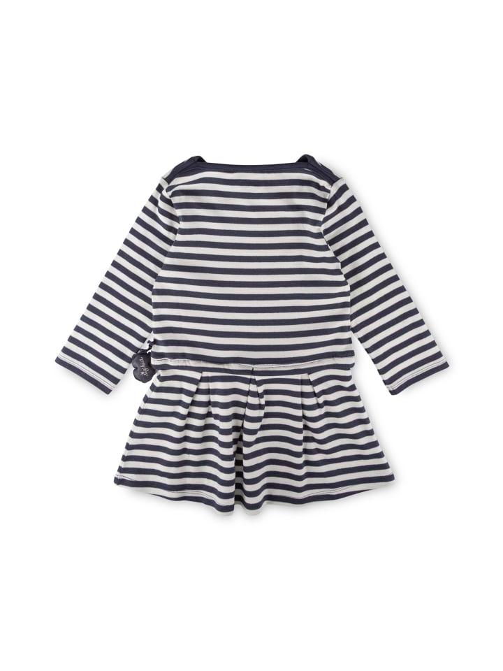 - Платье выполнено из ткани интерлок в темно-синюю и белую полоску