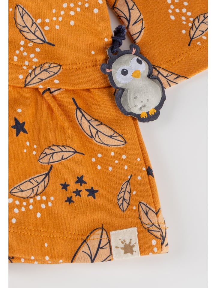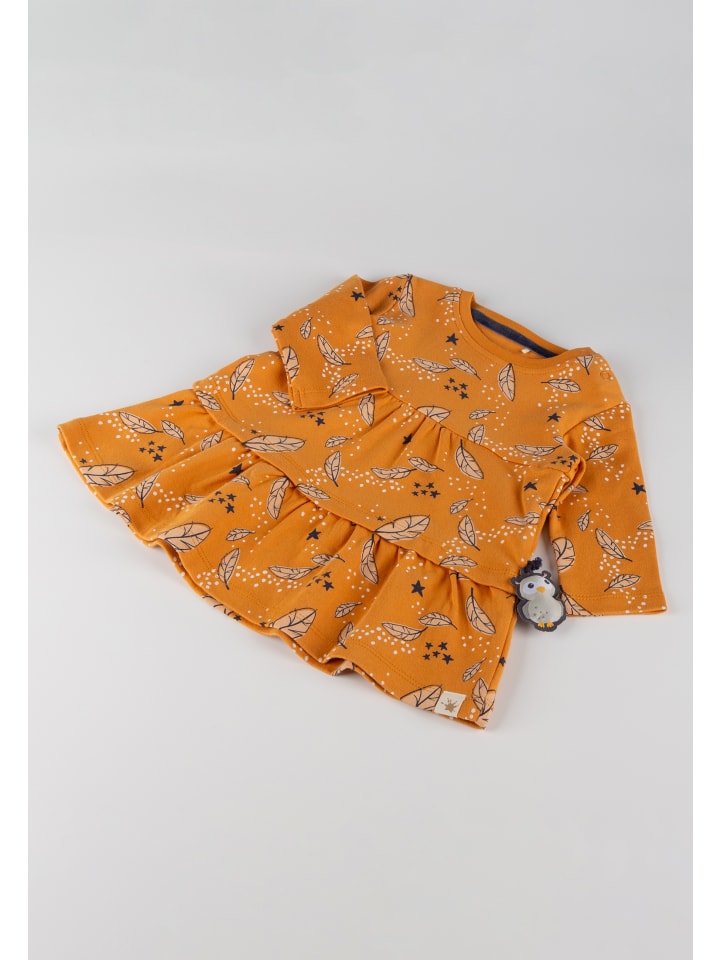 - Платье выполнено из трикотажного полотна интерлок цвета охры с принтом по всей поверхности.