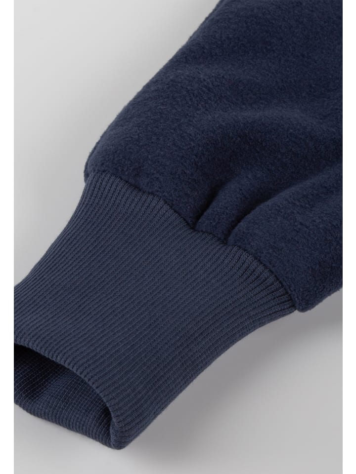 - Комбинезон выполнен из темно-синего флиса с внутренней стороны в оранжевую полоску.