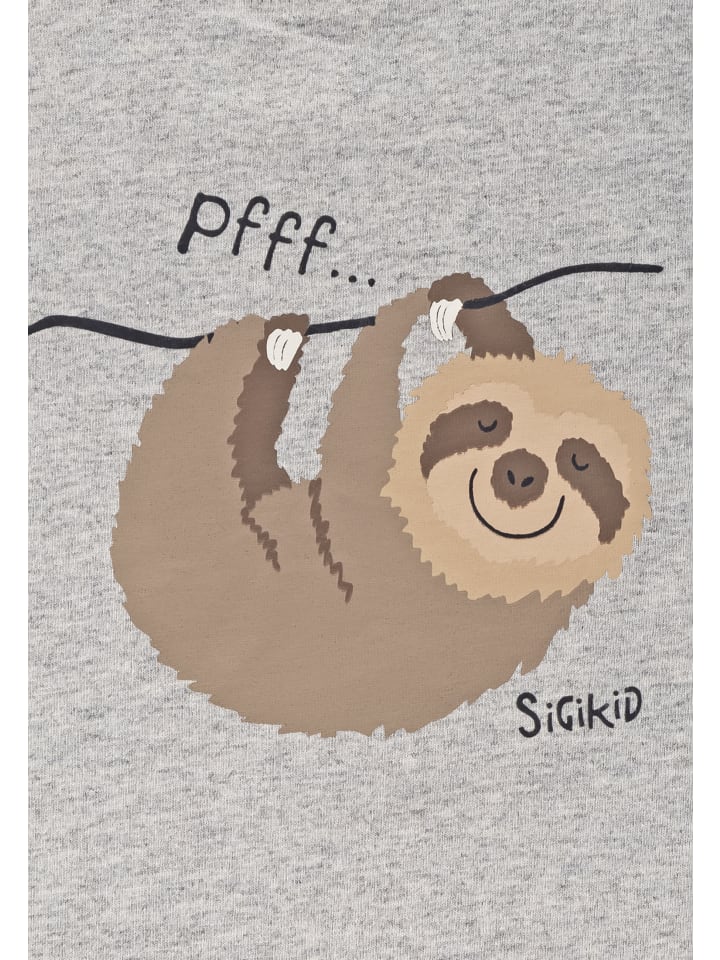 Детская пижама с короткими рукавами ленивец, детская одежда для сна sigikid, весна/лето 2024 г. Изготовлена из хлопка из контролируемого органического земледелия. Одинарный трикотаж, плотностью около 180 г/м². Футболка в мелкую серую полоску; принт с изображением ленивца. Длинные брюки в желтую/белую полоску с эластичным поясом, манжеты на штанинах, принт с надписью sigikid. Все ткани в наших детских пижамах сертифицированы по маркировке Confidence in Textiles OEKO-TEX Standard 100 без предупреждения (без предупреждения).