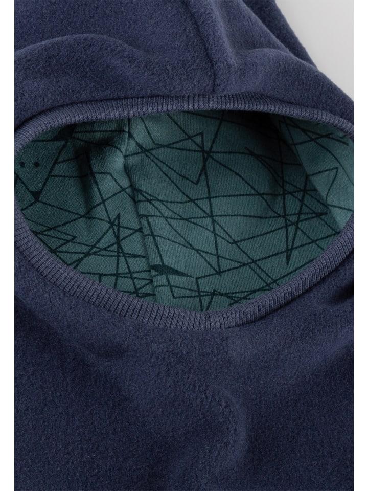 - Шапочка выполнена из темно-синего флиса, а внутренняя часть - из синего интерлок-джерси.