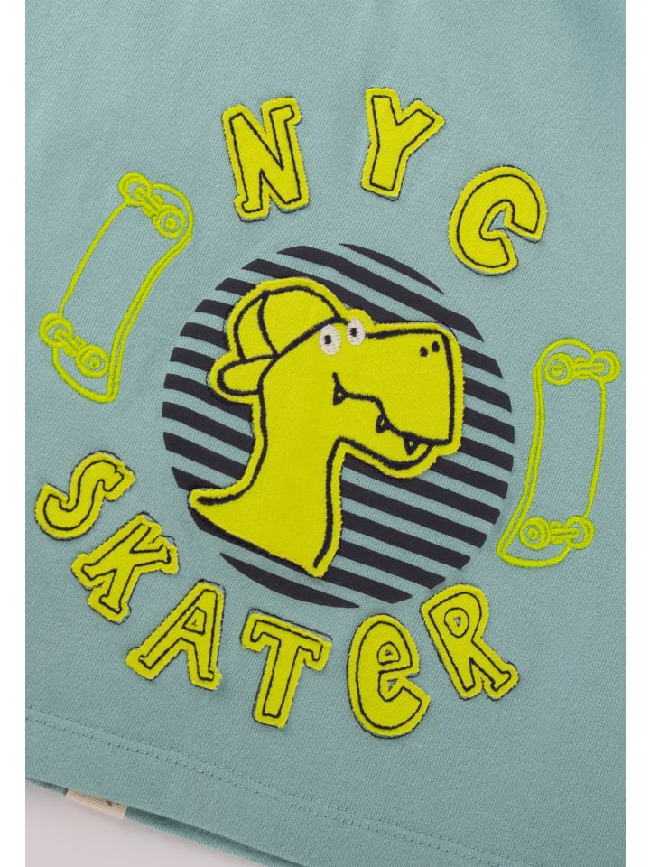 - аппликация, вышивка, принт: флокированный принт, аппликация с динозавром и аппликация NYC SKATER; вышитый скейтборд; лейбл Sigikid Klecks
