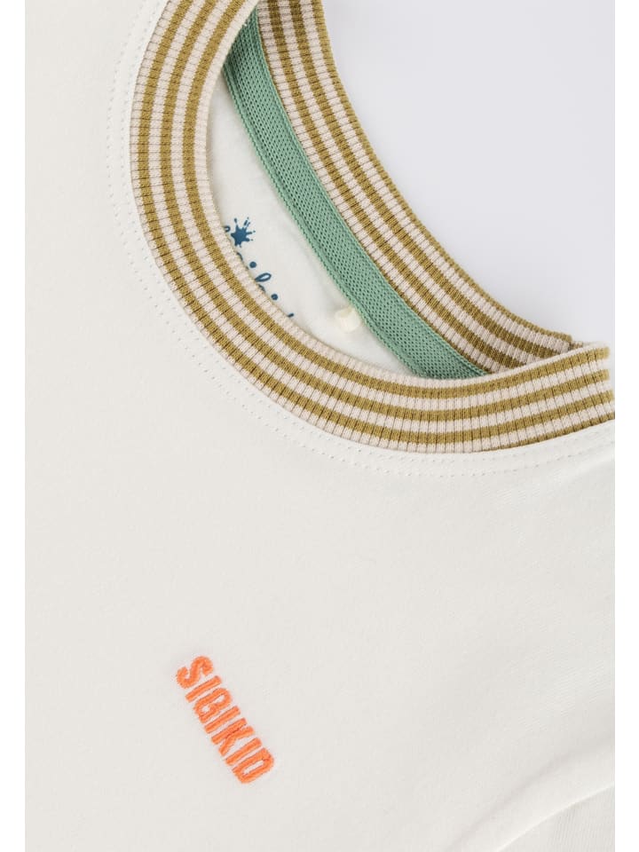 - Что делает эту вещь особенной: футболка с круглым вырезом, выполненным из эластичной резинки, и контрастными зелеными полосками