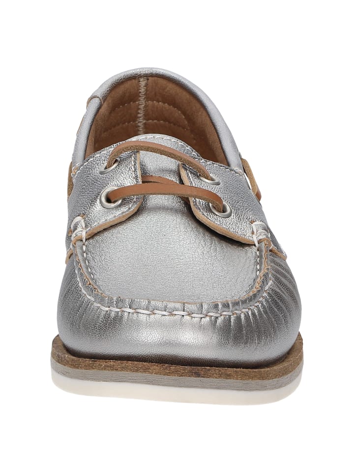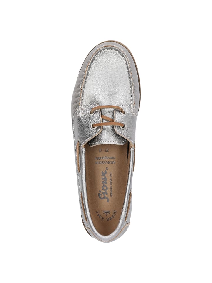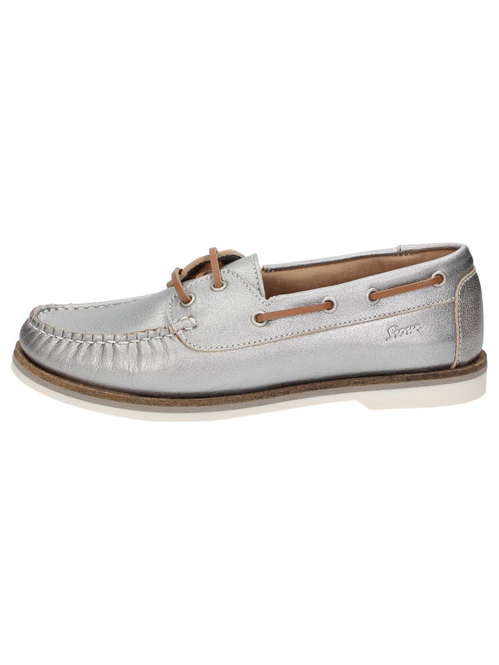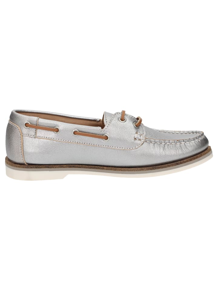 Спортивные женские туфли без подкладки на шнуровке в модном стиле доксайдер из металлизированной козьей кожи с мягкой кожаной стелькой, которую можно снять и заменить на свою. Мягкая, тонкая резиновая подошва с небольшим перепадом высоты пятки и удобная ширина G для оптимальной свободы пальцев гармонично дополняют эту модель.
