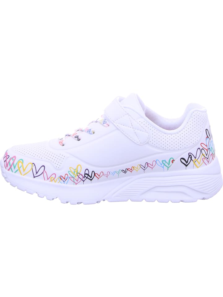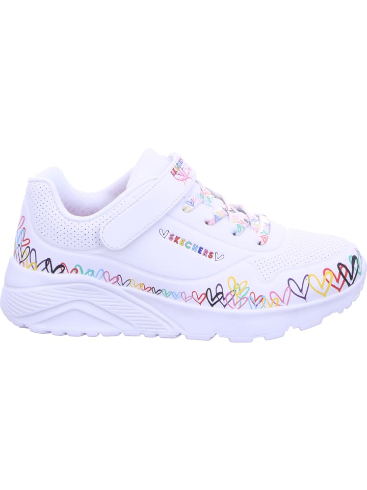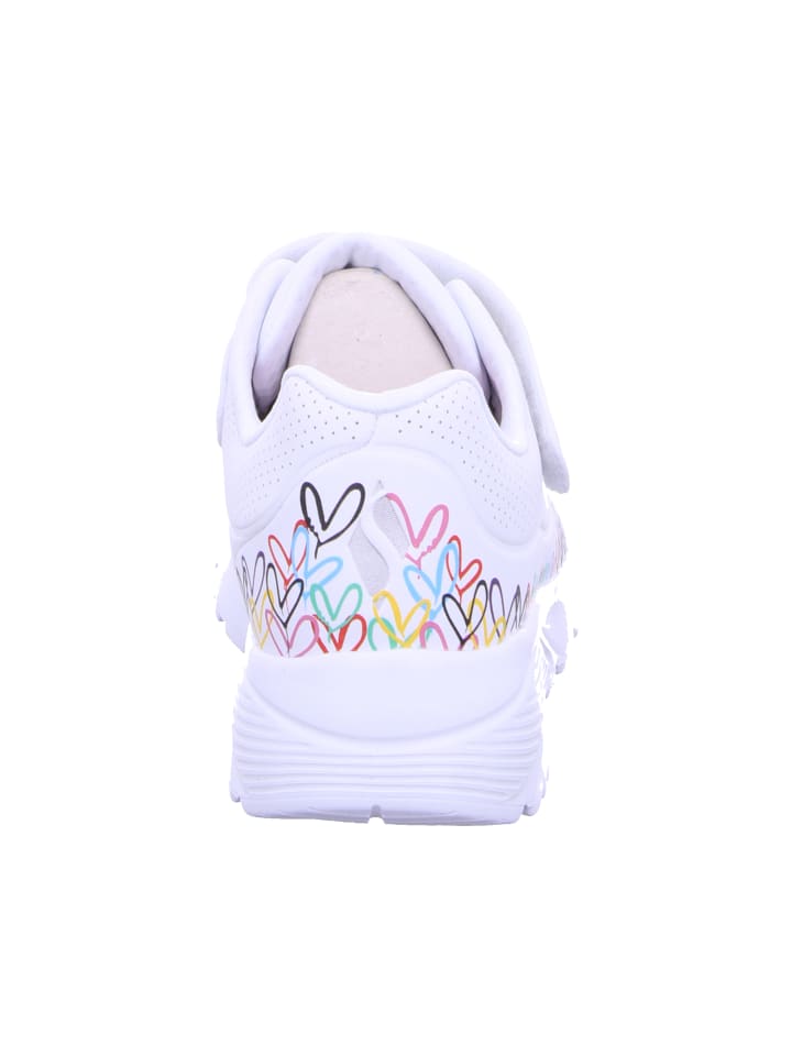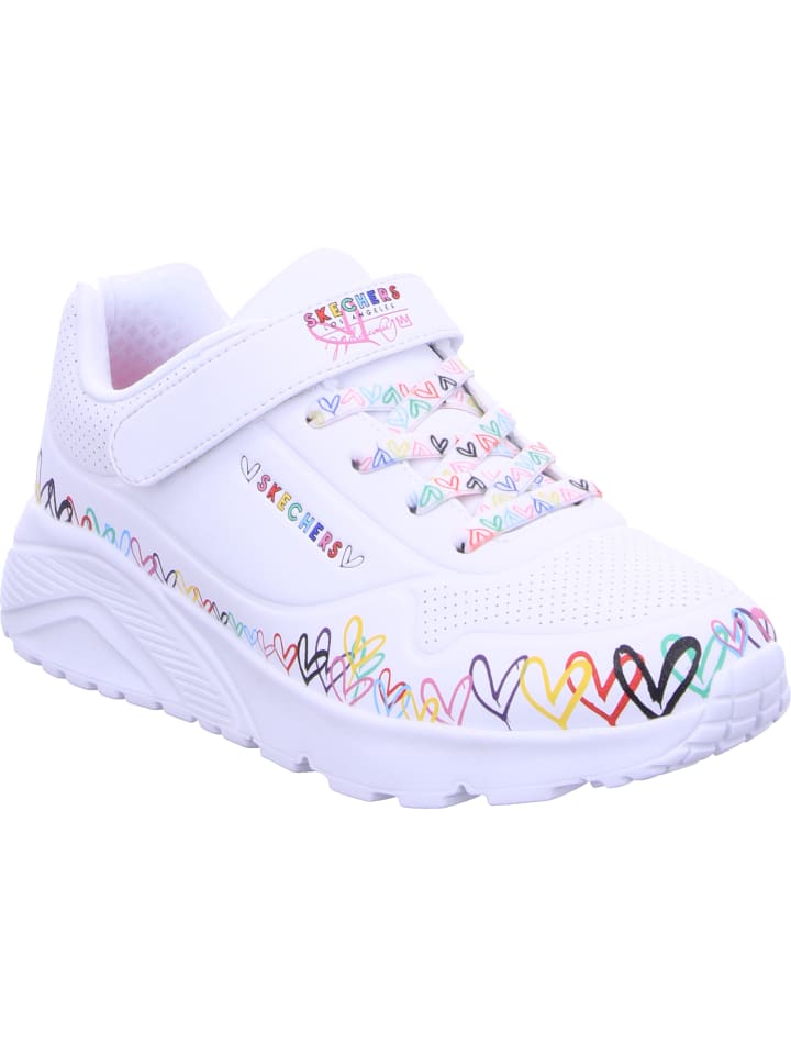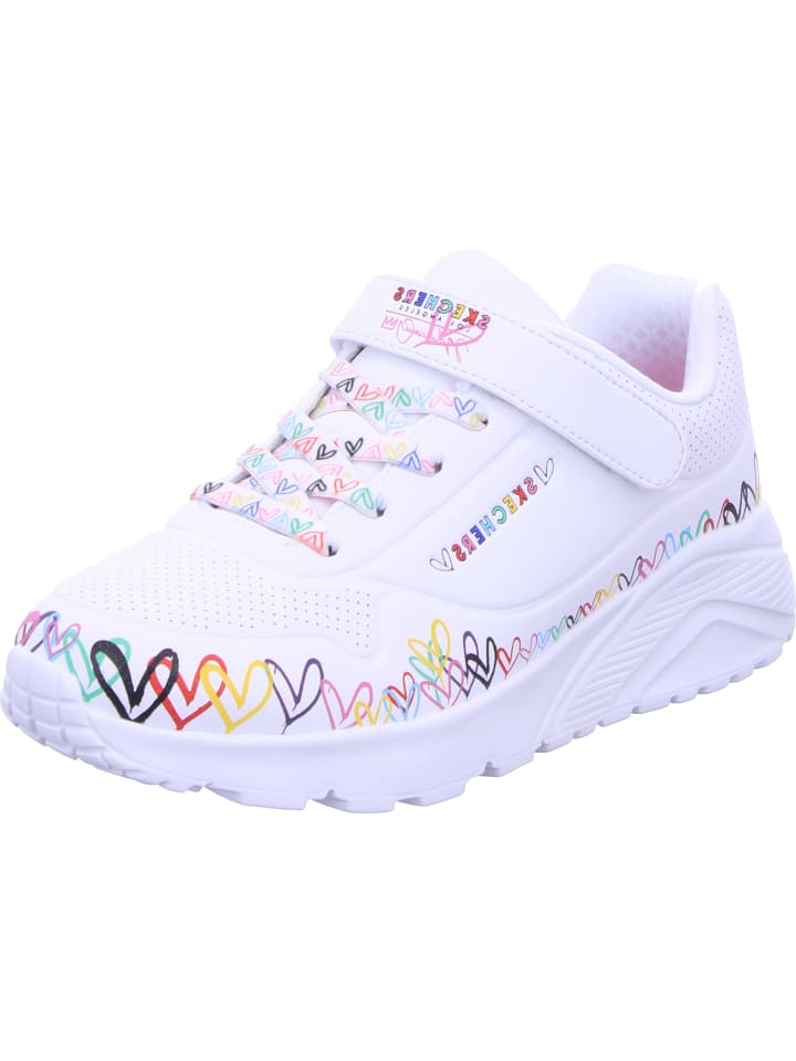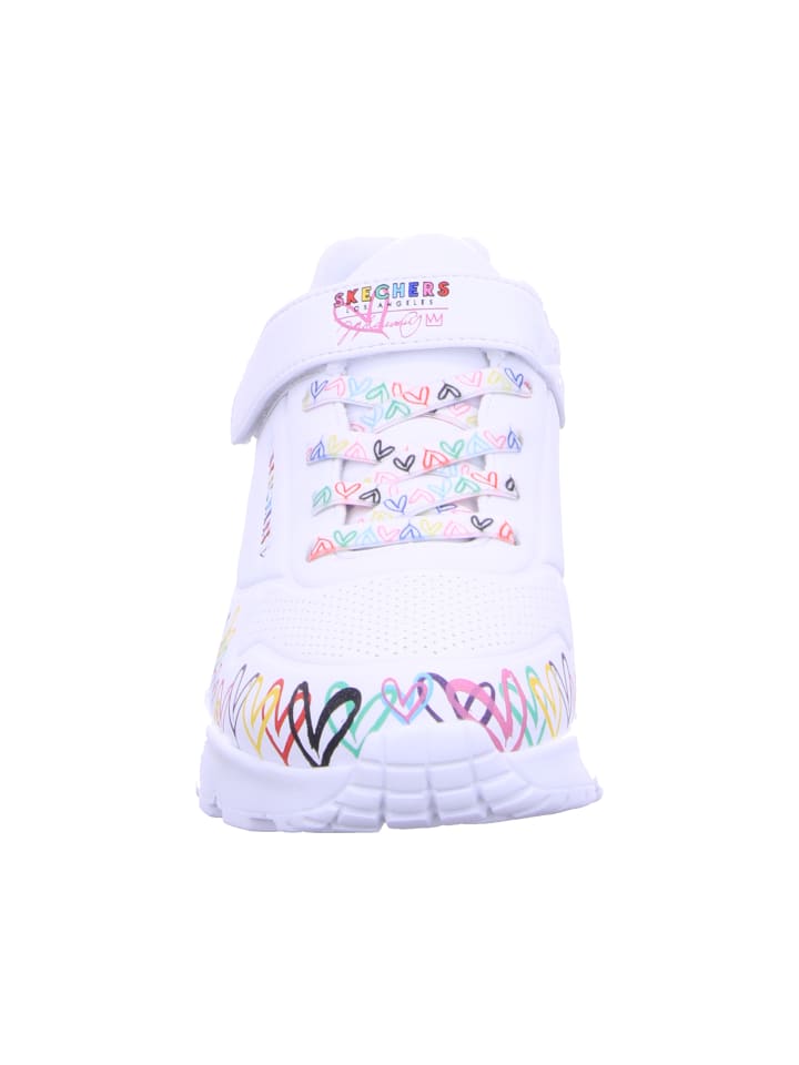 Всемирно известный художник-монументалист Джеймс Голдкраун дополнил некоторые модели коллекции Skechers x JGoldcrown своими культовыми сердечками Lovewall. Взгляните на креативный образ коллекции Skechers x JGoldcrown: Skechers StreetT Uno Lite - Spread the Love. Эти модные кроссовки на шнуровке, украшенные фирменным сердечным принтом художника вплоть до подошвы, имеют верх из синтетического материала Durabuck с перфорированной отделкой, а также стельку Skechers Air-Cooled Memory Foam и промежуточную подошву на платформе.
