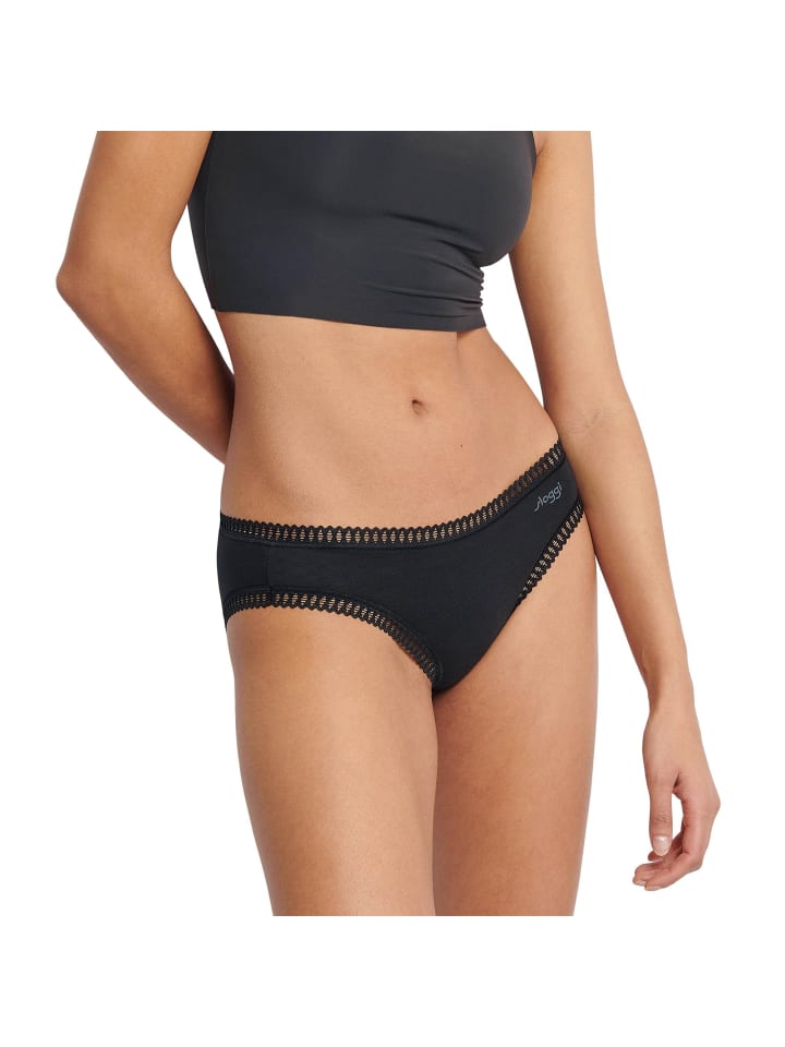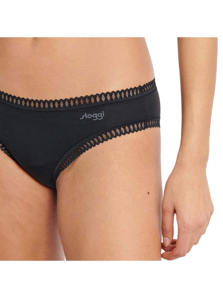 Шесть мини-трусиков для женщин от бренда Sloggi. Комплект из 4 однотонных и 2 с рисунком. Мягкий органический хлопок с добавлением эластичных волокон, сертифицированный GOTS.