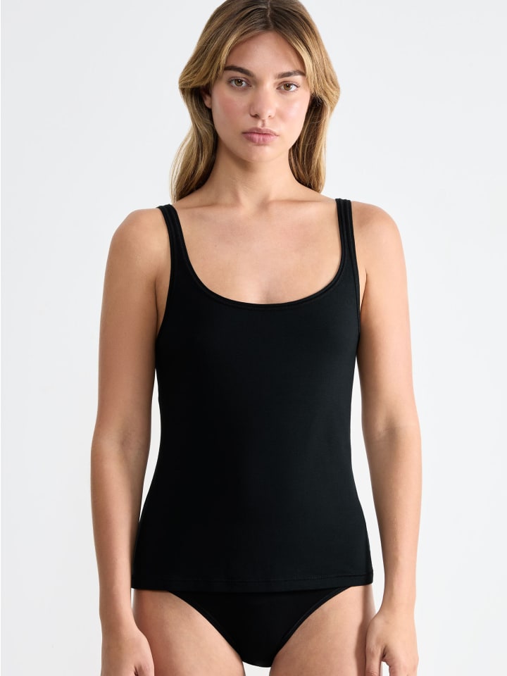 Ощутите непревзойденный комфорт в нашей терморегулирующей майке с круглым вырезом и тонкими бретельками для комфорта в течение всего дня. Она изготовлена из экологически чистых тканей, которые помогают регулировать температуру тела.