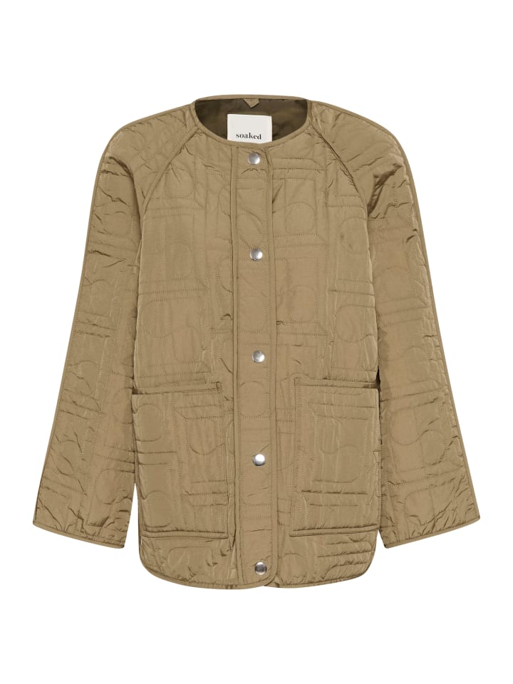 Стеганая куртка прямого свободного покроя с круглым вырезом, большими накладными карманами и застежкой на кнопках.