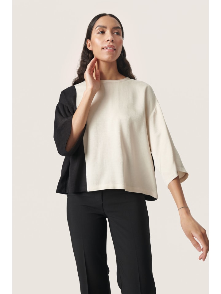 Топ свободного кроя в выразительном стиле колор-блок с круглым вырезом и широкими рукавами три четверти. Прямой крой, длина до бедер.