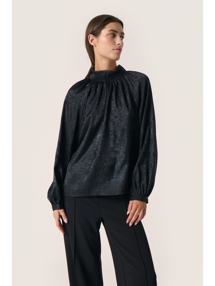 Блузка с металлическим эффектом, блестящей текстурированной поверхностью, высоким воротником-стойкой, присборенным вырезом и длинными объемными рукавами с манжетами.