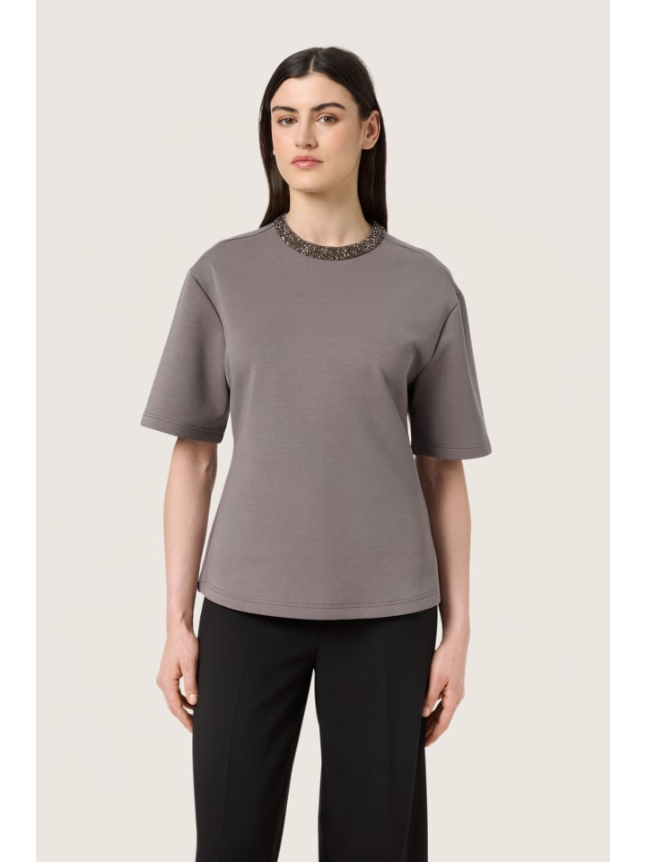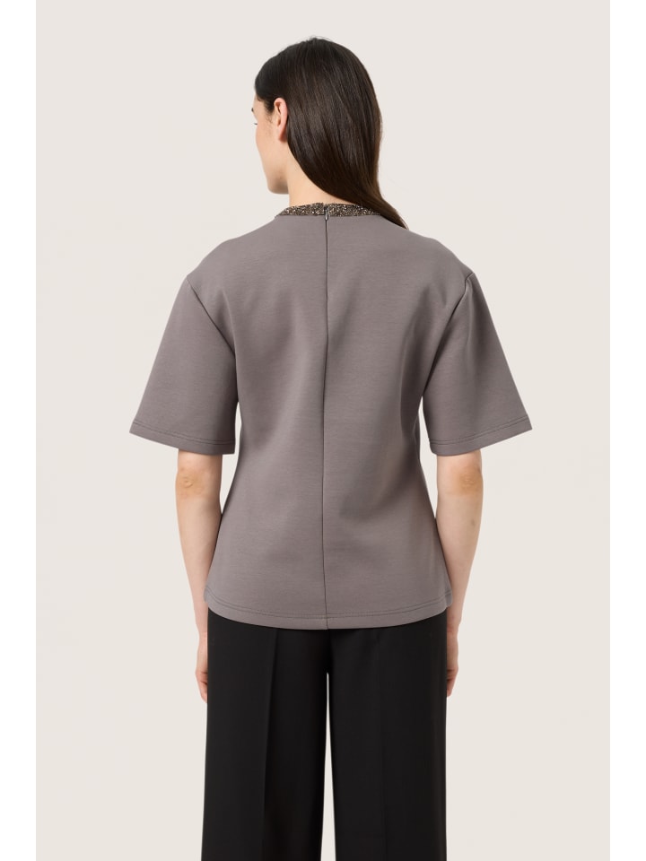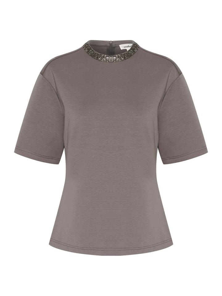 Топ с короткими рукавами, прямого покроя, круглым вырезом с привлекательной отделкой, гладкой текстурированной поверхностью и потайной молнией сзади.