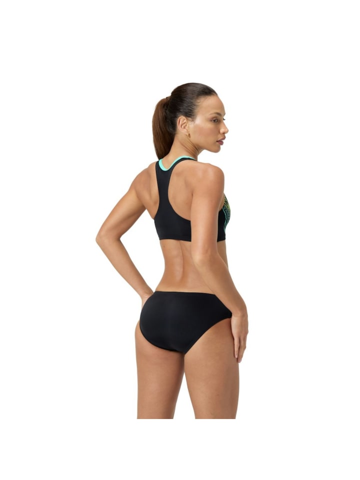 Стильный купальник с спортивным эффектом. Этот спортивный раздельный купальник, вдохновленный технологиями, украшен абстрактной изогнутой графической панелью в оттенках синего. Спинка-борцовка обеспечивает отличную гибкость во время фитнес-тренировок. Плавки оснащены поясом на шнурке, который поможет вам чувствовать себя уверенно и защищенно во время тренировки. Эта модель изготовлена из нашего прочного материала Endurance+, который быстросохнет и на 100% устойчив к хлору.