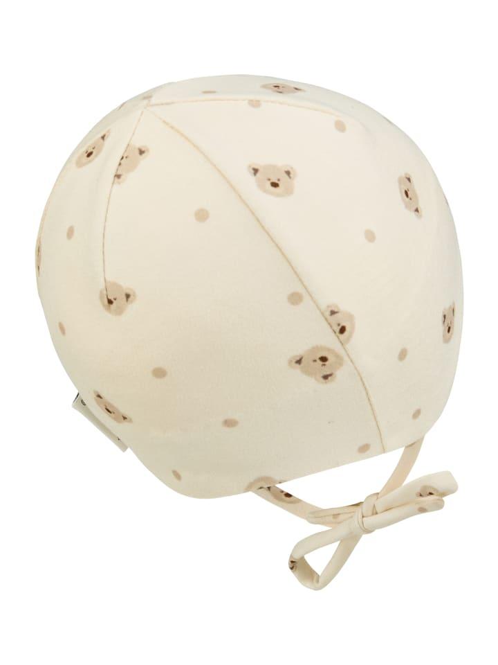 Шапочка из мягкого на ощупь трикотажа с принтом в виде головок медведей /// пришитыми ушами /// завязками