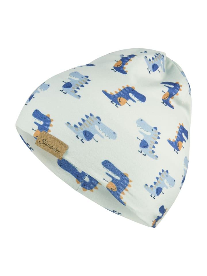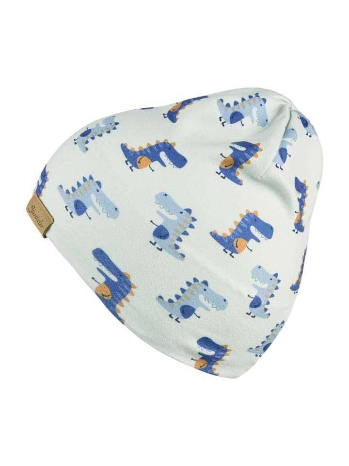 Шапочка из мягкого на ощупь трикотажа с принтом динозавров /// Два варианта ношения