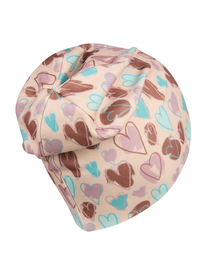 Шапочка из мягкого на ощупь трикотажа с принтом в виде сердечек /// Два варианта ношения
