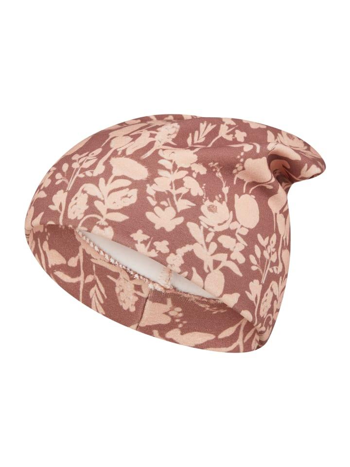 Шапочка из трикотажного полотна с пушистой спинкой, напечатанной в виде цветочных завитков.